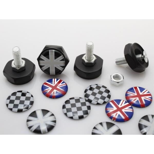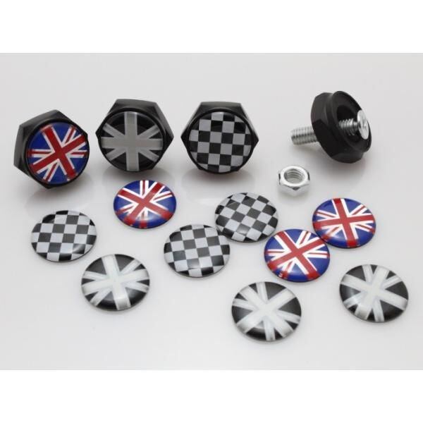 BMW MINI ミニクーパーなどに最適 ナンバープレート ボルト カバー 全3色 4個セット ユニオンジャック チェッカーフラッグ ライセンスボルト