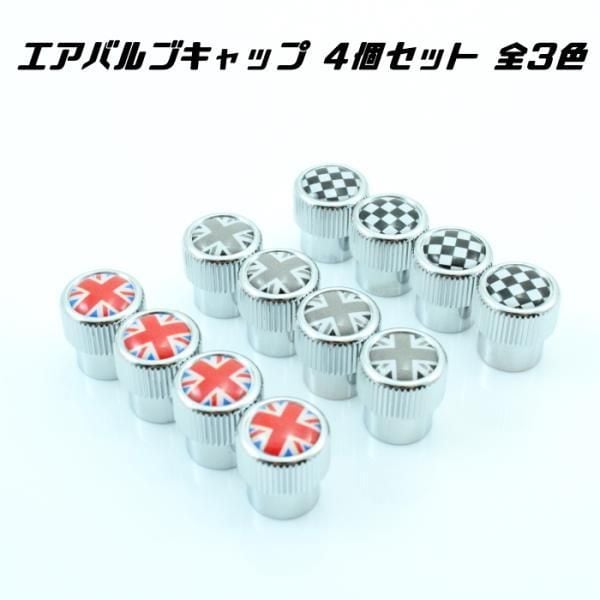 タイヤ エアバルブキャップ シルバー 4個セット 全3色 ユニオンジャック チェッカーフラッグ BMW MINI ミニクーパー などに最適