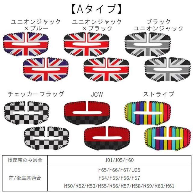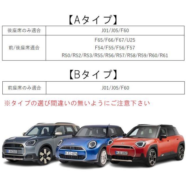 J01 J05 F60 後部座席のみ ,F65 F66 F67 U25 前/後部座席共通 ,F54 F55 F56 F57 前/後部座席共通 ,R50 R52 R53 R55 R56 R57 R58 R59 R60 R61 前/後部座席共通