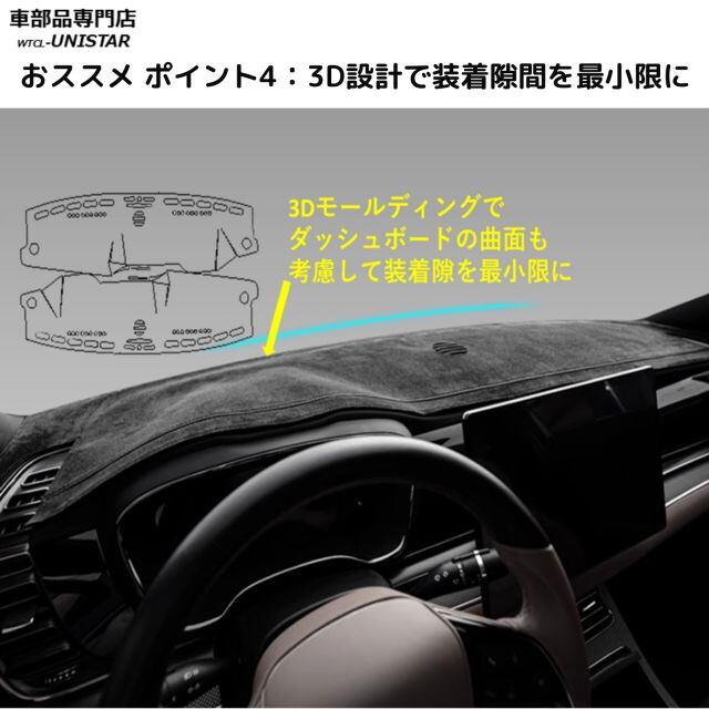 ★3Dモールディングでできるだけダッシュボードの装着面の隙間を少なくしました。★車種専用の開口設計でスピーカーやエアコン吹き出し口に影響しない設計です。★裏の接地面は滑り止め仕様なので、運転中にずれたりすることは極力防げます。