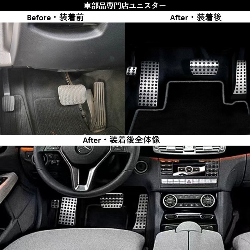 車の中で過ごす時間をさらに快適に演出するために、メルセデスベンツオーナー様にお勧めのアイテムです。ペダルとブレーキの滑り止め加工が施されており、運転中の安定感をサポート。さらに、車内のデザインも一新し、乗り心地やスタイルを向上させます。